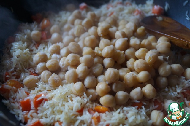 Всыпаем почти готовый нут, отцедив от него воду, и тщательно перемешиваем.