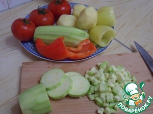 Берем кастрюлю (у меня 3-х литровая), наливаем воду (примерно 3/4), ставим на огонь. Пока вода закипает готовим овощи.