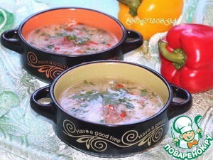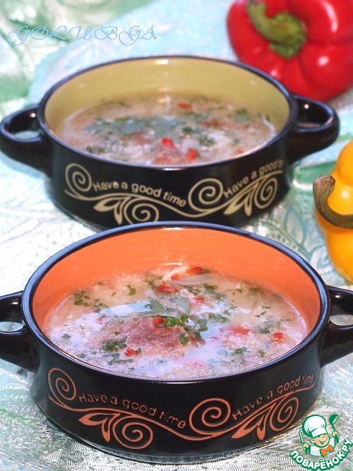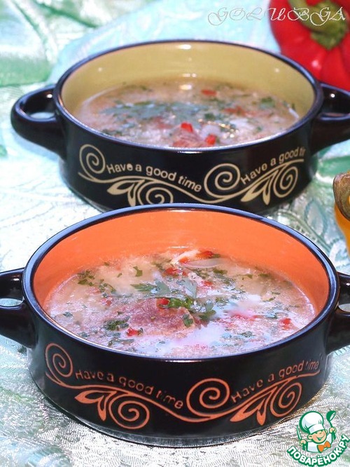 При подаче положить в суп ломтики говядины и посыпать мелко рубленной зеленью. Можно добавить сметаны.
