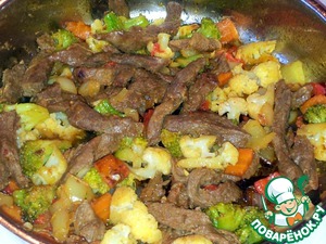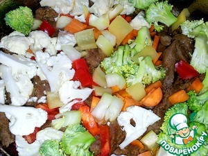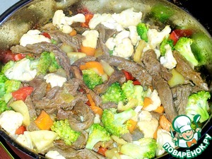 Нарезала не мелко овощи - брокколи, цветную капусту, перец белый и красный, лук, морковь и положила в сковороду к мясу.