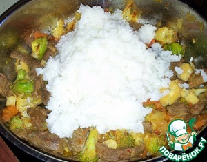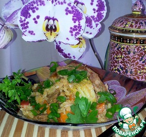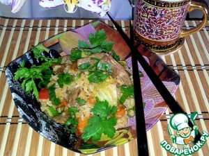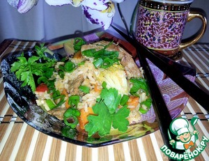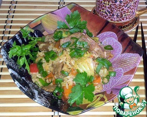 Жарила мясо, овощи и рис до готовности. Когда выключила плиту, положила мелко нарезанный зубчик чеснока и закрыла крышкой. Через 10 минут разложила рис по тарелкам.