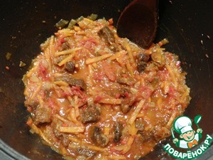 Добавляю пюре из помидоров, морковь, перец красный жгучий.