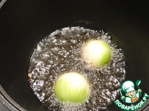 Казан хорошо прогреваю, наливаю растительное масло, нагреваю его и опускаю в казан оставшуюся луковицу, очищенную от кожуры и разрезанную пополам. Лук, переворачивая, обжариваю до темного цвета, чтобы масло пропиталось луковым ароматом. Обжаренную луковицу удаляю, она больше не понадобится.