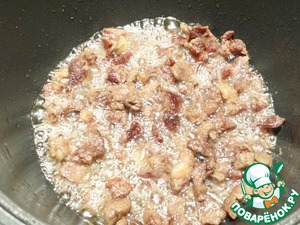 Добавляю мякоть баранины, хорошо перемешиваю. Обжариваю мясо слегка, до легкой румяной корочки (я чуть пережарила мякоть, надо внимательно следить, т. к. мясо быстро зажаривается). С помощью шумовки достаю мясо на отдельную тарелку.