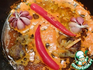 Как только будущий зирвак чуть закипит, добавляю в него чеснок и стручковый перец. Тушу ингредиенты под закрытой крышкой примерно 30-40 минут.