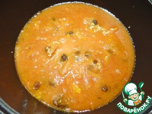 Увеличиваю немного огонь, и вливаю морковный сок, чуть прикрыв им содержимое казана. Сок вливаю не весь оставшийся сразу, а порциями, пока рис не сварится практически полностью. Конечно, можно влить всю порцию сока сразу, если Вы уверены в особенностях выбранного Вами риса.