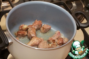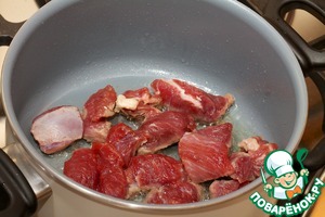 Сначала нарезаю баранину на небольшие кусочки, выкладываю их в глубокую сковородку (сотейник).