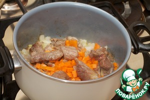 Затем добавляю морковь, нарезанную небольшими кубики, и жарю ещё пять минут.