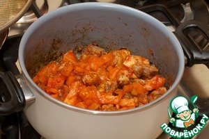 Добавляю мякоть помидор (томат-пюре не в сезон), обжариваю ещё 10 минут.