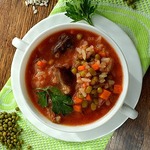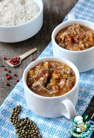 Мошубиринч - это одно из блюд таджикской кухни. Суп приготовлен в глубокой сковороде с мясом, рисом и бобами маш. Вкусное и сытное блюдо. За рецепт спасибо "Кухне Востока"