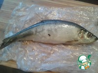 Чистим селёдку. На доску кладём ДВА пакета. Это делается для того, чтобы потом долго и упорно не отмывать доску от селёдочного запаха. В один пакет идёт голова с внутренностями. На втором работаем дальше.