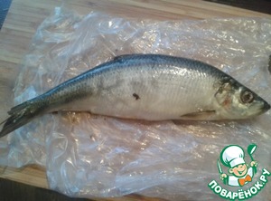 Чистим селёдку. На доску кладём ДВА пакета. Это делается для того, чтобы потом долго и упорно не отмывать доску от селёдочного запаха. В один пакет идёт голова с внутренностями. На втором работаем дальше. -