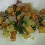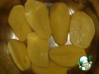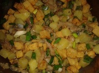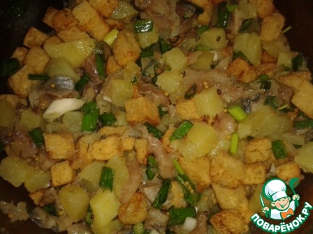 Дёргаем у мамы с грядки лук. Чистим, крошим. Картошку и селёдочное филе режем на небольшие кубики.