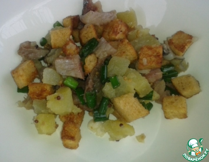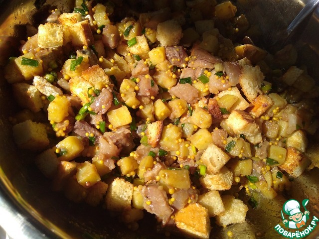 Добавляем уксус, горчицу, масло. Перемешиваем. Перед подачей на стол добавляем сухарики, перемешиваем.