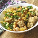 Для сухариков во все салаты я использую свой хлеб (330 мл тёплого молока или тёплой воды с сухим молоком или просто воды, 2 ч. л. сухих дрожжей, 1 ч. л. соли, 1 ст. л. сахара, 2 ст. л. жидкого масла (оливковое, кедровое и пр. растительное), 600 гр муки, специи по вкусу. На фото с прованскими травами и паприкой 1 ст. л.