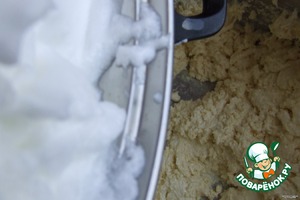 Выложить взбитые в крутую пену белки. Осторожно перемешать сверху в низ всю массу, поворачивая миску.