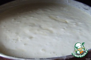 Намазать форму густым слоем масла и обсыпать мукой.Выложить в нее бисквит, разровнять и поставить в слабо нагретую духовку на 1 час. Выпекать при температуре 180 градусов.