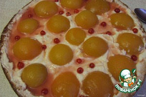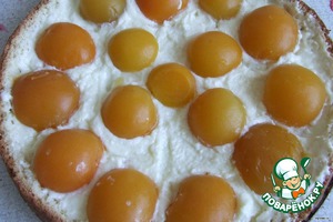 Сверх него разложить половинки абрикосов, разрезом вниз, так, чтобы закрыть ими крем (правда у меня немножко не хватило абрикос, так как ребенок решил попробовать :D). Поставить торт в холодильник на 15 минут.