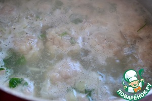 Кладем в воду клецки, рис и варим их примерно 30 минут