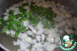 Доводим до кипения воду, кладем петрушку, лук и соль