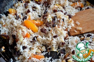 Заливаем рис водой так, чтобы она покрывала его на палец больше, доводим до кипения, накрываем крышкой и готовим минут 7. Потом добавляем шафрановую воду и кипятим все еще минут 5-6.