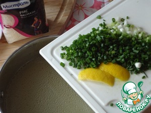 Налейте бульон в кастрюлю, добавьте цедру лимона кусочком, имбирь, зеленый лук. Имбирь я предварительно пропускаю через пресс. Доведите до кипения. Если хотите суп менее густой, то возьмите бОльшее количество бульона.