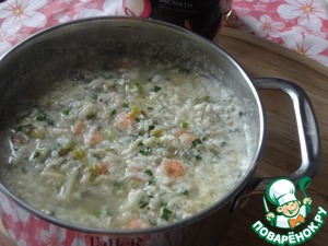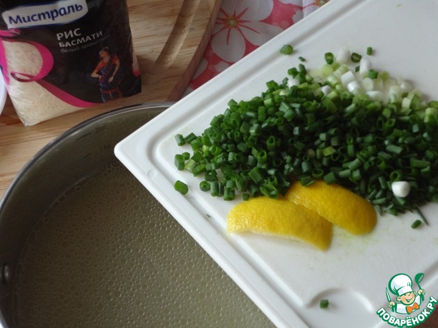 Отмерьте рис. Промойте его до прозрачности. Всыпьте рис в бульон и снова доведите до кипения. Убавьте огонь. Накройте крышкой и дайте покипеть около 8 минут. Я использовала рис БАСМТИ ТМ Мистраль. Его длинные зерна очень удачно вписываются в этот суп. Так же время приготовления риса этого сорта (12минут) идеально для этого рецепта.