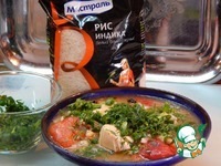Цыпленка вынимаем, нарезаем на куски. Бульон процеживаем. В готовый бульон добавляем помидоры, соль, специи и рис. Готовим 20 минут. |