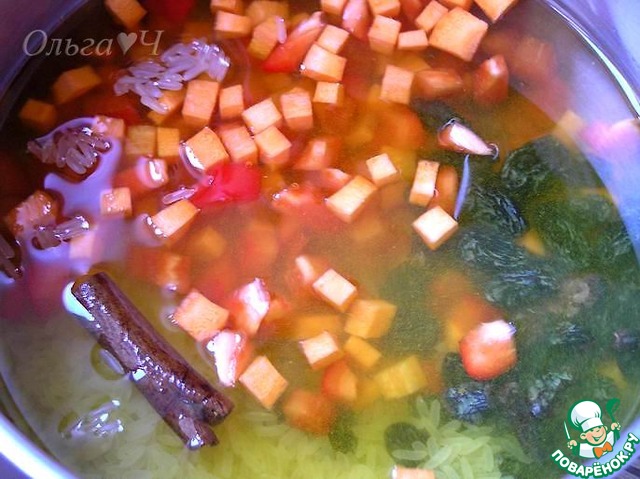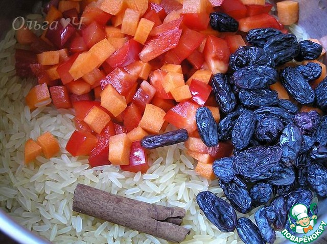 Рис всыпать в касрюльку. добавить нарезаные кубиками морковь и сладкий перец, изюм и палочку корицы.