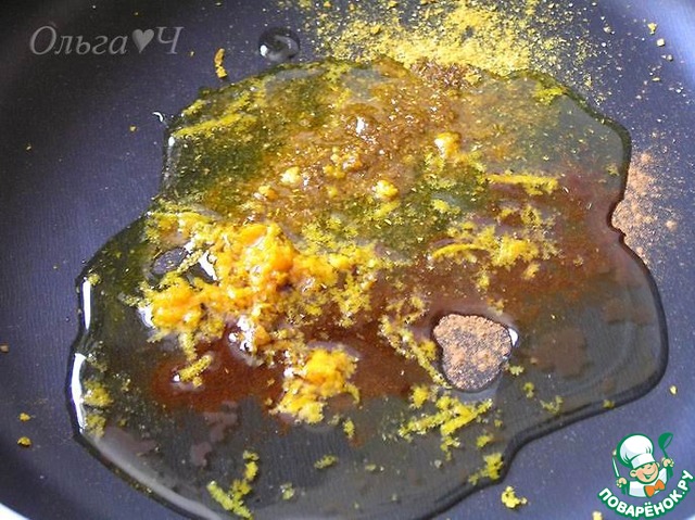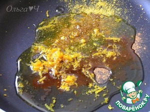 Тем временем в сковороде разогреть растительное масло, добавить цедру, карри, корицу и куркуму. Готовить 2 минуты помешивая, снять с огня.