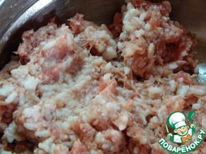 Отваренный заранее рис смешиваем с приготовленным фаршем, добавляем специи.