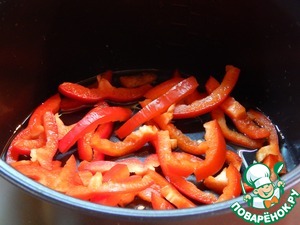 Долму готовим в мультиварке. На дно мультиварки выливаем оливковое масло, выкладываем перец, слегка обжариваем минуты 3.