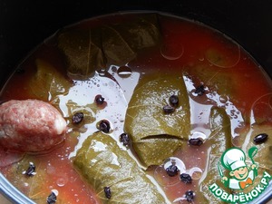 Выкладываем долму на перец, заливаем томатным соком и включаем режим Тушение. Тушим 100 минут.