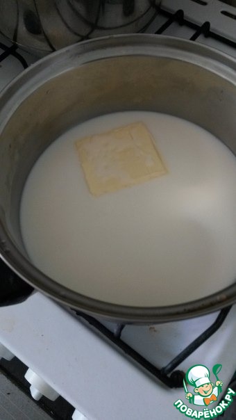 В кастрюлю кладём масло, добавляем молоко и ставим на плиту, чтобы закипело.
