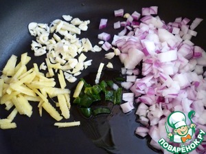 На 1 ст л разогретого оливкового масла обжариваем измельченные имбирь, чеснок, перец чили (без семян) и лук в течение 3-4 минут