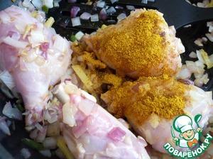 Добавляем к овощам разделанную курицу (я снимаю шкурку) и карри. Обжариваем в течение 5-6 минут