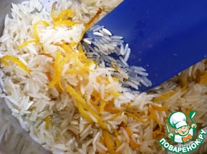 В кастрюле растапливаем сливочное масло, добавляем оливковое масло и цедру. Всыпаем рис. Немного солим. Обжариваем рис в течение 2 минут. Вливаем кипяток (400 мл) и варим 10 минут.