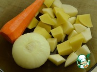2. Картофель, лук и морковь почистить. вымыть. Картофель нарезать средним кубиком. лук мелким кубиком, морковь натереть на терке. |