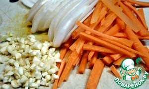 Нарезаем лук, очищенные чеснок и морковь.