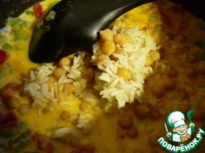 С нута и риса слейте воду. Добавьте нут с рисом к овощам в кокосовом молоке и доведите до готовности риса (еще минут 15)