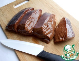 Печень очень тщательно промыть и нарезать крупными кусками.