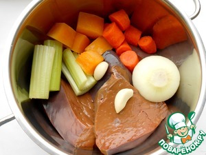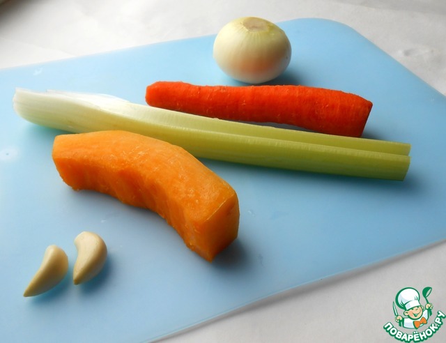 Подготовить овощи: лук, морковь, чеснок. В этот раз я добавила еще стебель сельдерея и кусочек тыквы. Нарезать крупными кусками.