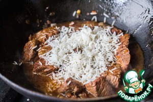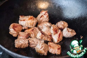 Традиционно для этого блюда используют баранину. В наших краях хорошую баранину найти не так просто, поэтому я использую говядину. Лучше всего подойдут мягкие части говядины, тонкий край, толстый край, лопатка, грудинка. Если вы берете другую часть мяса (например, заднюю, тазобедренную), то может потребоваться больше времени для его мягкости. Говядину помыть, нарезать на крупные кусочки. В казане разогреть растительное масло или жир. Обжаривать мясо до румяной корочки.