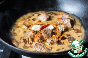 Влить в казан стакан воды, добавить чеснок, перец чили. Уменьшить огонь и томить под крышкой 40-60 минут. Время томления зависит от того, какое у вас мясо. Пробуйте его, когда оно будет мягким, но при этом крепким (не разваренным) приступайте к следующему шагу.
