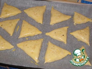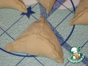 В центр положить по ложке начинки и защипать края треугольником в виде маленьких слоечек.