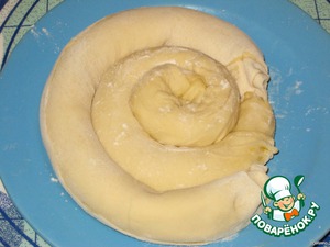 Смазать сплошь тонким слоем растопленного сливочного масла. Скатать в рулет, а затем свернуть в улитку.