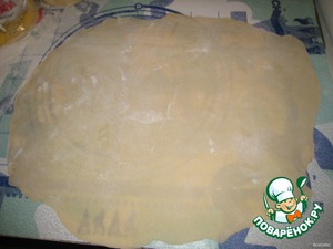 Тесто раскатать в тонкий пласт, как можно тоньше, в 1 мм толщиной.