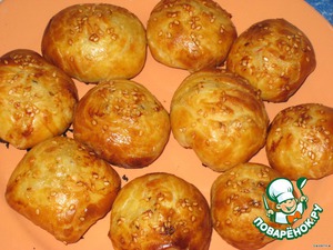 Выложить на противень швом вниз, сверху смахать разболтанным желтком с молоком и посыпать кунжутом.