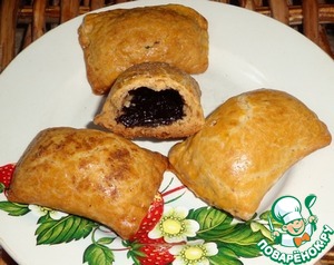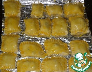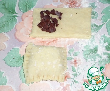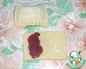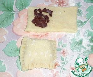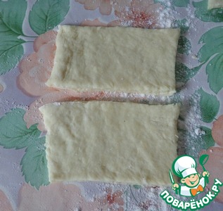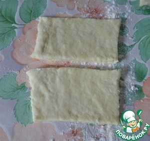 Тесто раскатать в пласт толщиной 3 мм. Тесто разрезать на прямоугольники (длина=8см; ширина=4 см).