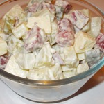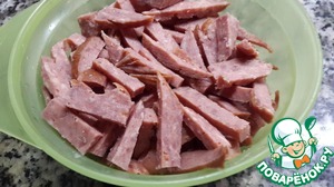 Поместить картофель в микроволновку и готовить 10-12минут (до готовности). остудить и порезать брусочками примерно1см.x1см.